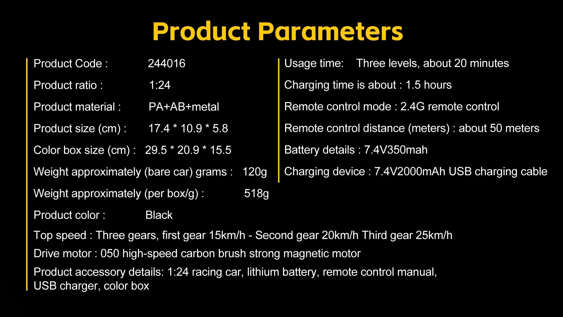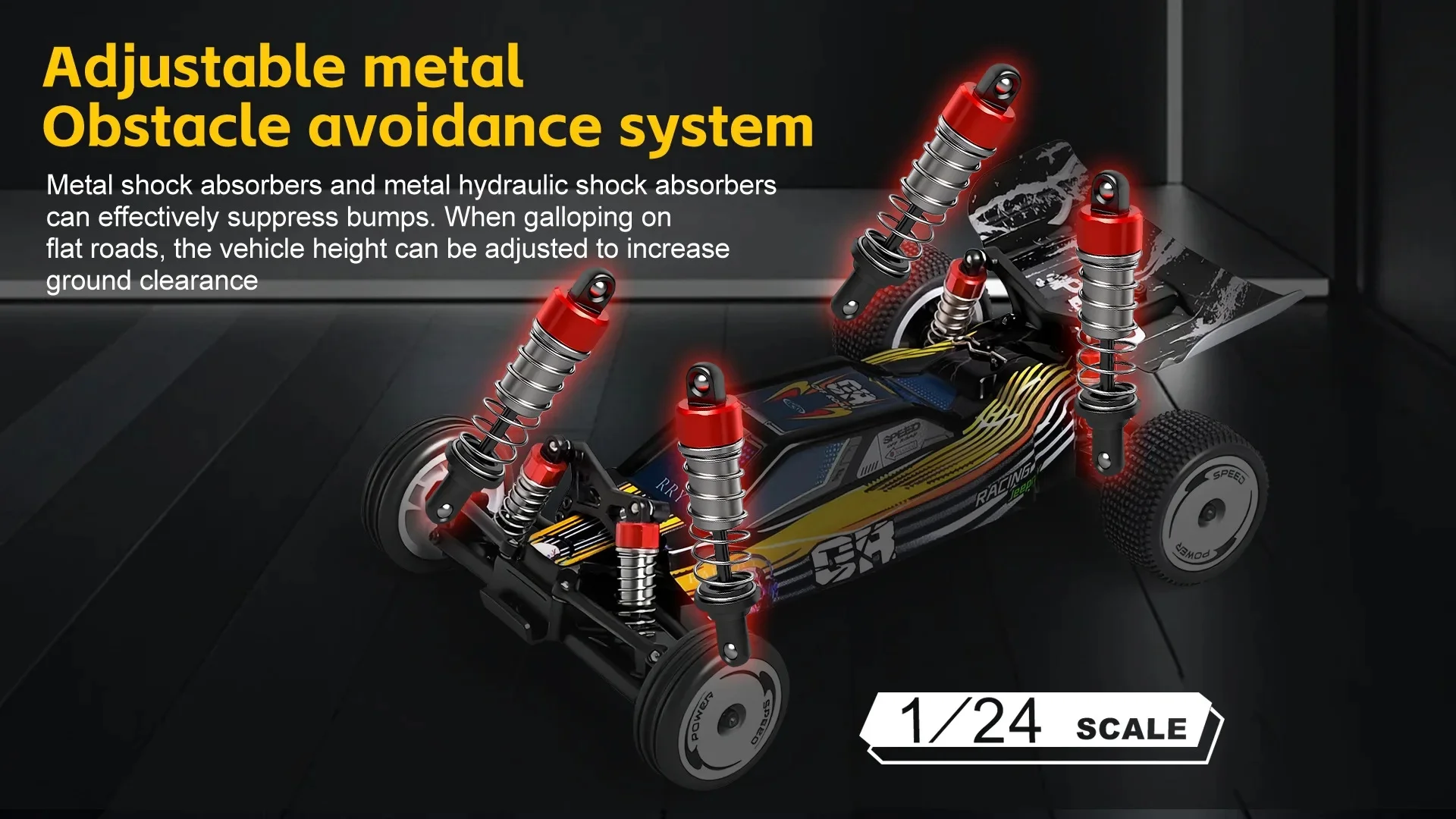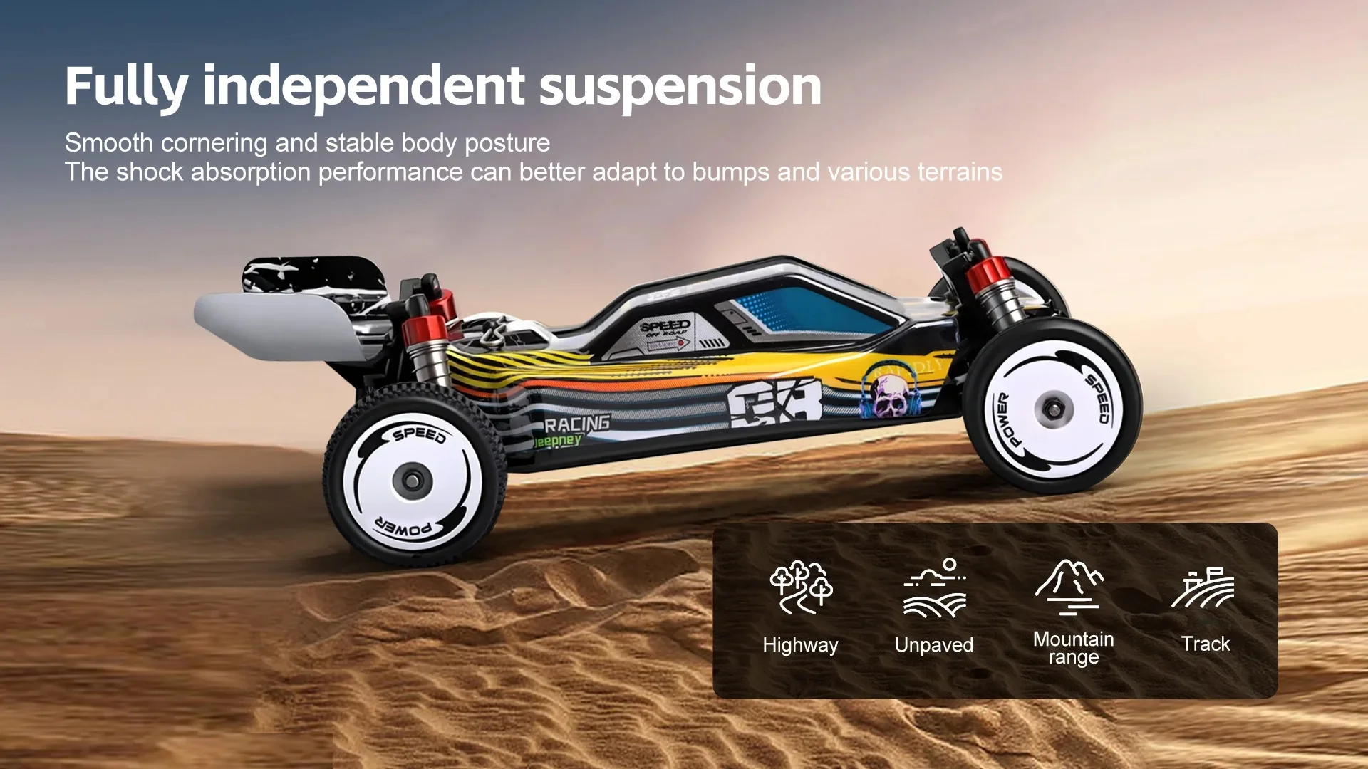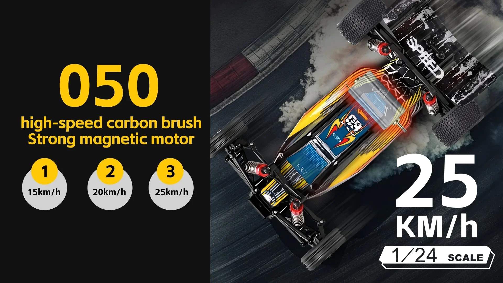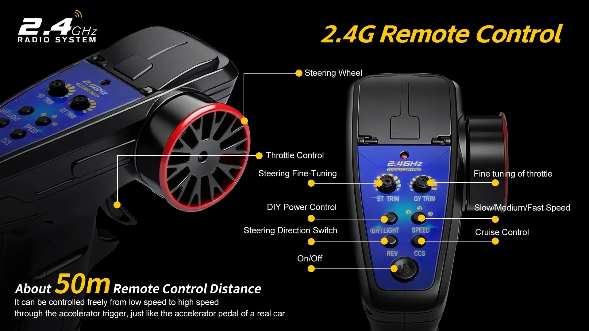 2. Features a 2.4G full-scale synchronous remote control system, with full-scale throttle/steering and adjustable three-speed settings.